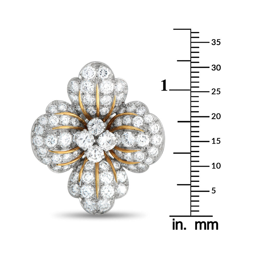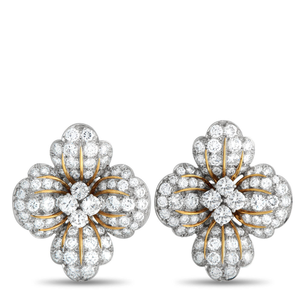 These Bvlgari clip-on earrings showcase a stunning 7.0-carat total weight of sparkling round-cut diamonds, expertly set in a dramatic flower-shaped design. Crafted from a refined blend of platinum and radiant 18K yellow gold, each earring measures 1.25” long by 1.15” wide, combining luxury with timeless elegance.